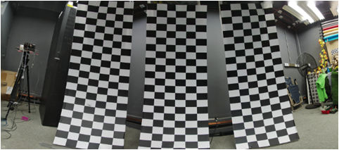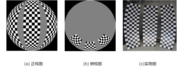 若棋盘格没有覆盖整个球面,则需保证各个相机之间的重叠区都能够覆盖棋盘格角点。从标定技术上,棋盘格只需要覆盖成像重叠区即可,所以若是非全景相机,可根据产品形态及产线要求对理想标定环境进行简化,并保证棋盘格为球弧面分布,格子大小尽量保持一致,且分布均匀。下面章节将以双鱼眼及四路水平结构为例说明,其他全景相机结构请根据实际情况调整。