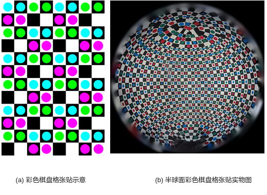 若是双鱼眼或者四路水平结构简化标定环境,也是基于原本的黑白棋盘格按照同样的分布规律张贴彩色圆形贴纸。