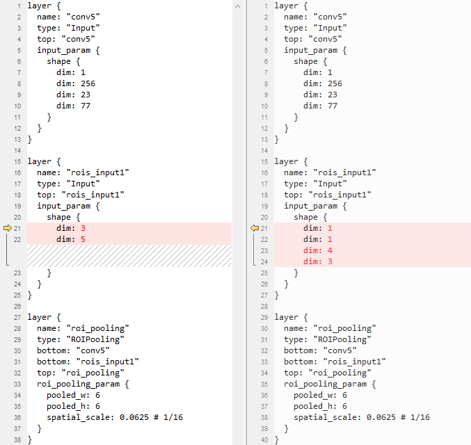 如果用户使用Faster RCNN、YOLOv3、YOLOv2、SSD等Caffe框架网络模型进行模型转换,由于此类网络中包含了一些原始Caffe框架中没有定义的算子结构,如ROIPooling、Normalize、PSROI Pooling和Upsample等。为了使图像分析引擎能支持这些网络,需要对原始的Caffe框架网络模型进行扩展,降低开发者开发自定义算子/开发后处理代码的工作量,详细扩展方法请参见检测网硬化加速prototxt示例。