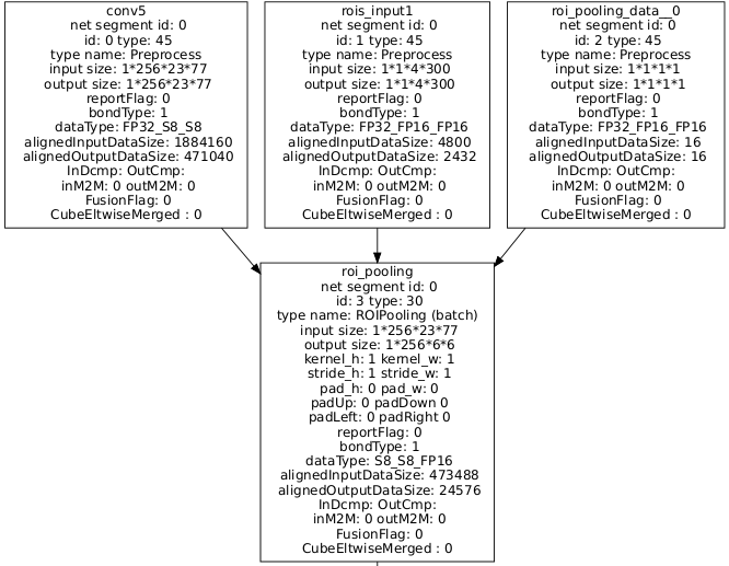 板端只支持1种ROI区域(第2个data层)输入格式,类似ATC工具的第2种输入格式。ATC工具的输入配置为格式1)或2),不影响最终生成的om支持的输入格式。板端需要的ROI输入维度为1×1×H×MaxRoiFrameCnt,其中H等于prototxt中配置的H,MaxRoiFrameCnt等于cfg文件中指定的max_roi_frame_cnt。当ActualRoiNum < MaxRoiFrameCnt,每一行需要补齐到MaxRoiFrameCnt个点。Roi/Psroi Pooling算子会按照min(MaxRoiFrameCnt, ActualRoiNum)计算。