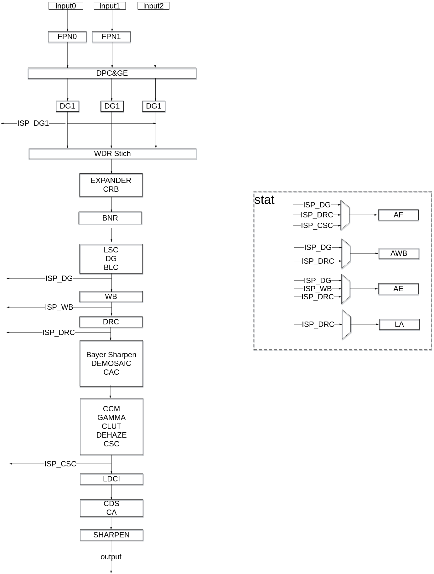 ISP SS928V100的功能结构图如图1、图2、图3所示。此图与本文中提到的ISP_FE均代指ISP pipeline中FPN(不包含)之前的部分,ISP_BE均代指ISP pipeline中FPN(包含)之后的部分。