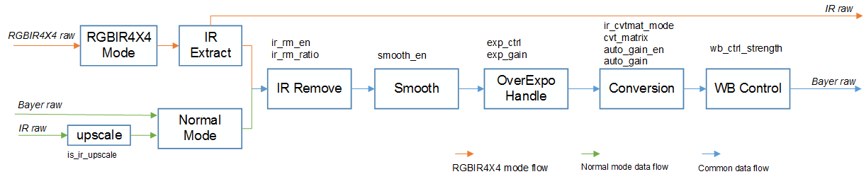 RGBIR分为RGBIR4X4模式及RGBIR Normal模式。RGBIR4X4模式支持输入RGB-IR4x4单通道信号,输出正常Bayer格式raw信号及IR raw信号供其他应用;RGBIR Normal模式支持输入Bayer raw及IR raw双通道信号,输出Bayer格式信号。非RGB-IR4x4信号可通过软件(如DSP)拆分为Bayer raw及IR raw,并使用RGBIR Normal模式实现减IR串扰处理。