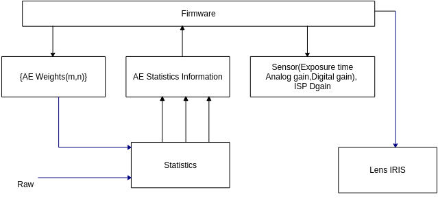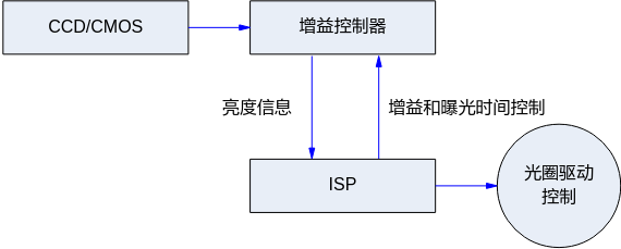 AE算法的主要工作原理是实时获取输入图像的统计信息并与设定目标亮度进行比较,而动态调节sensor的曝光时间和增益以及镜头光圈大小以达到实际亮度与设定目标亮度接近。其工作原理如图2所示。