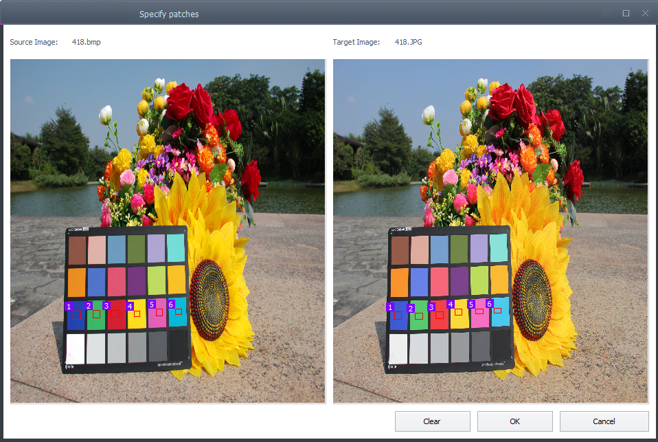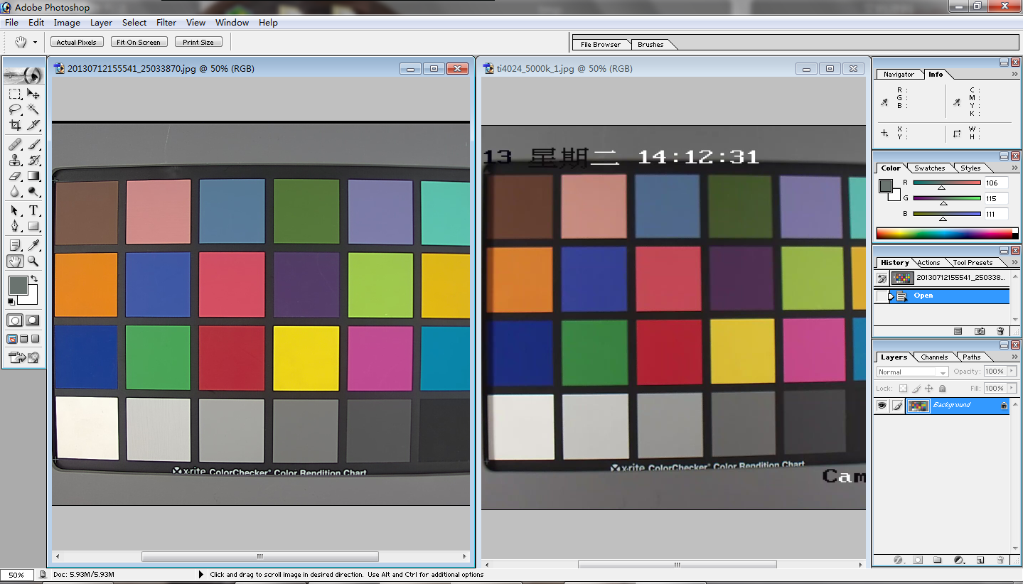 在右侧的info框中可以对比查看两幅图像的同样色块的R/G/B分量值,通常我们会更注重肤色、红色、绿色的校正。也可以对比标准色卡的R/G/B分量值进行对比。