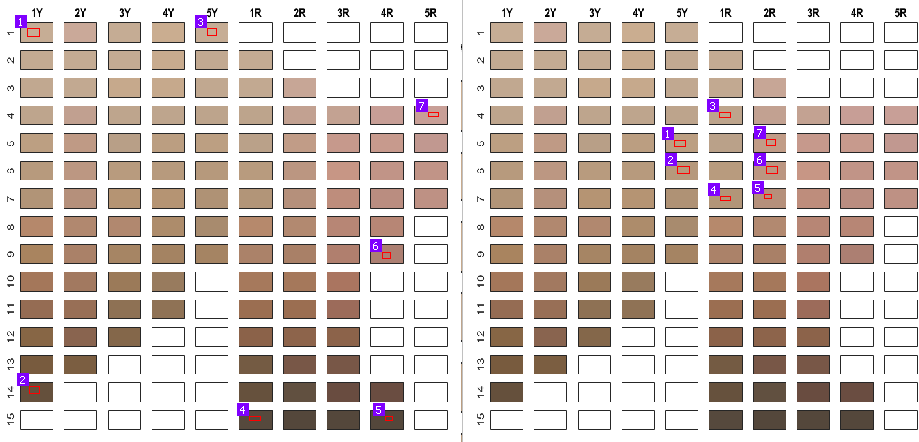 将PQ ISP Calibration Tool校正出来的颜色校正矩阵配置到硬件寄存器后,抓取一副自己的24色卡图像和一副标杆的24色卡图像,在Photoshop中进行颜色对比: