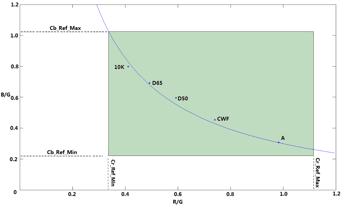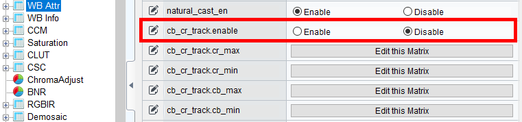 色差参数和sensor、光学器件强相关,建议用户对参数进行精调。 AWB Firmware将cr_max、cr_min、cb_max、cb_min四个参数和色温、ISO建立了联动,每个参数用户需要配置长度为16的数组。在标定部分说明怎样检查灰点条件配置是否合理。 |