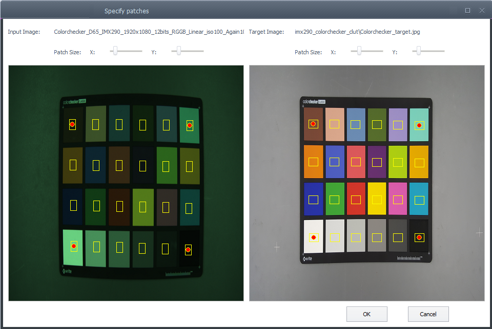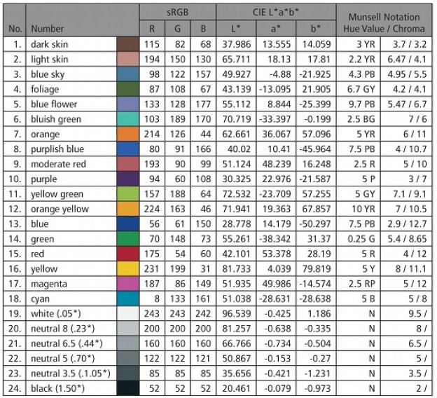 使用源设备和目标设备同时拍摄色卡,可以很容易的获得广泛的颜色样本,指导CLUT表的生成。使用X-Rite的ColorChecker色卡可以获得24个颜色样本对,使用X-Rite的ColorChecker SG色卡可以获得140个颜色样本对。