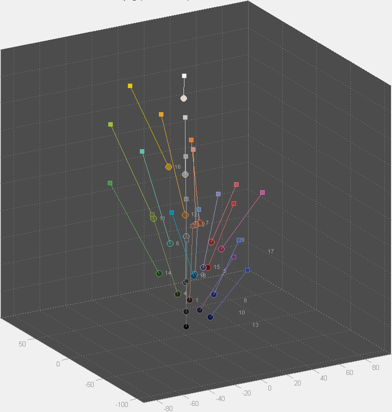 从图4可以看出蓝色红色的误差最好分布在亮度维度上,因为如果红色和蓝色的误差分布在饱和度上,容易过饱和而超出色域。黄色的误差不用在意,因为在色卡中黄色属于这个画面亮度最高的色块,如果这张图片降低一个亮度等级,那么黄色块的颜色误差自然会好一些。