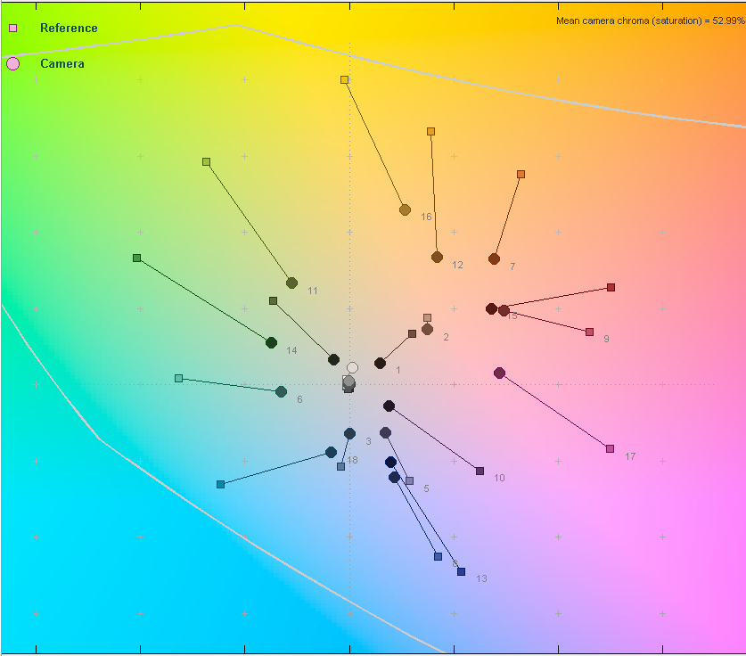 色域边缘的颜色向色域外映射的风格,指的是在CCM达到的颜色的基础上,将饱和度高的区域的颜色向色域外映射。特点是饱和度高的颜色的饱和度会增加,会更容易发生RGB中有值小于0或者大于1的现象。可以让颜色更鲜艳,突出画面中的主体。适用于光谱响应比较差的sensor,饱和度由CLUT补足,可以避免CCM的系数过大。这种调试目标会让饱和度中低的颜色在CCM的作用下不过于鲜艳,优先保留饱和度高的颜色层次。