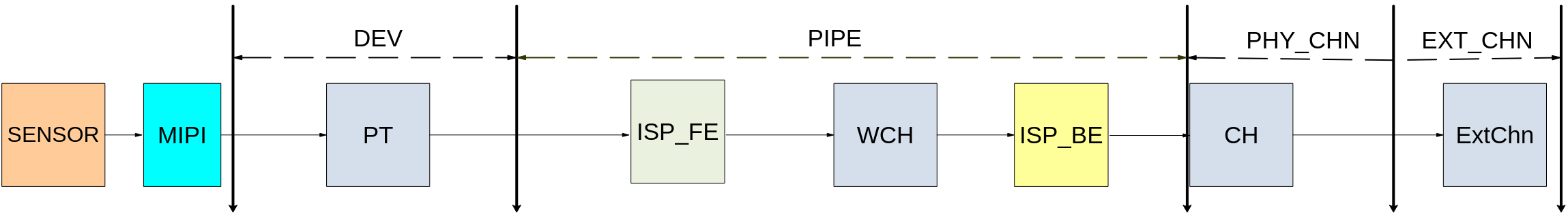 VI从软件上划分了输入设备(DEV),输入PIPE(图示为物理PIPE,虚拟PIPE只包含ISP_BE)、物理通道(PHY_CHN)、扩展通道(EXT_CHN)四个层级。各芯片的设备、PIPE、通道个数差异如表1所示。