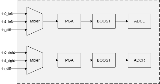 当OT_ACODEC_ADCL_SELECT_TRACK的入参与OT_ACODEC_ADCR_SELECT_TRACK一致时,最终输出的数据仅入参中指定的声道有效,且其数据来源为原始左声道。例如OT_ACODEC_ADCL_SELECT_TRACK和OT_ACODEC_ADCR_SELECT_TRACK同时选择了0,则最终输出的数据仅左声道有效,且其数据来源于原来的左声道。