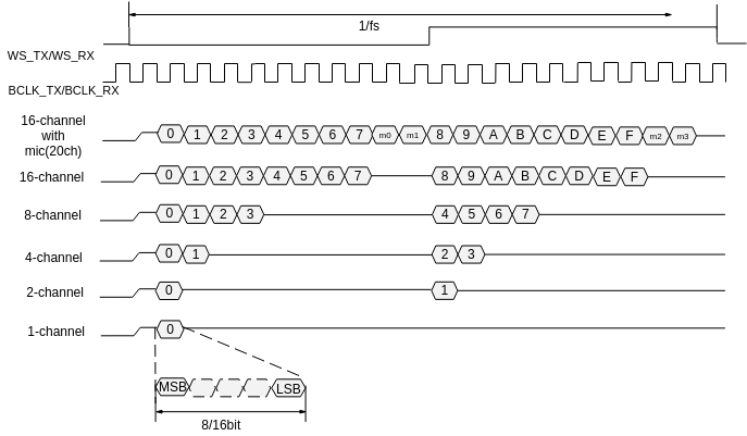 当AI设备使用多路复用的I2S接收模式时,标准的I2S协议只有左右声道这个概念,AI设备最大支持左右声道各接收128bit音频数据。此时假设Codec具有复用功能,可以将16路16bit采样精度的音频数据复用为2路128bit的I2S左右声道数据,那么AI设备可以解析这16路音频数据,并称这16路音频数据为16个音频通道。
