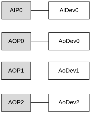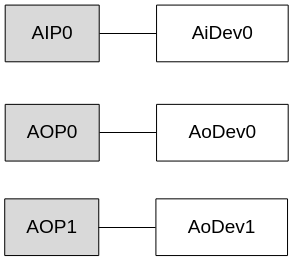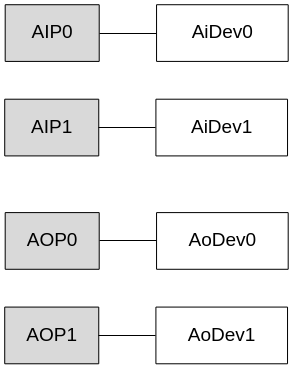 对每个输入输出接口,软件根据该接口支持的功能,分别与AI设备和AO设备建立映射关系。例如:AIP0只支持音频输入,则AIP0映射为AiDev0;AOP0只支持音频输出,则AOP0映射为AoDev0。