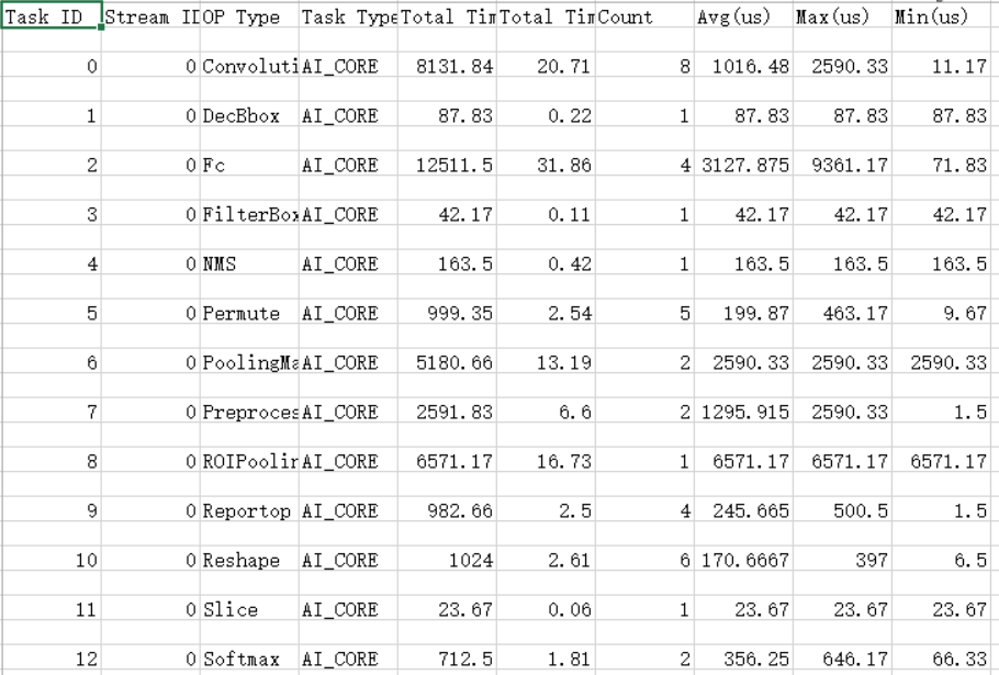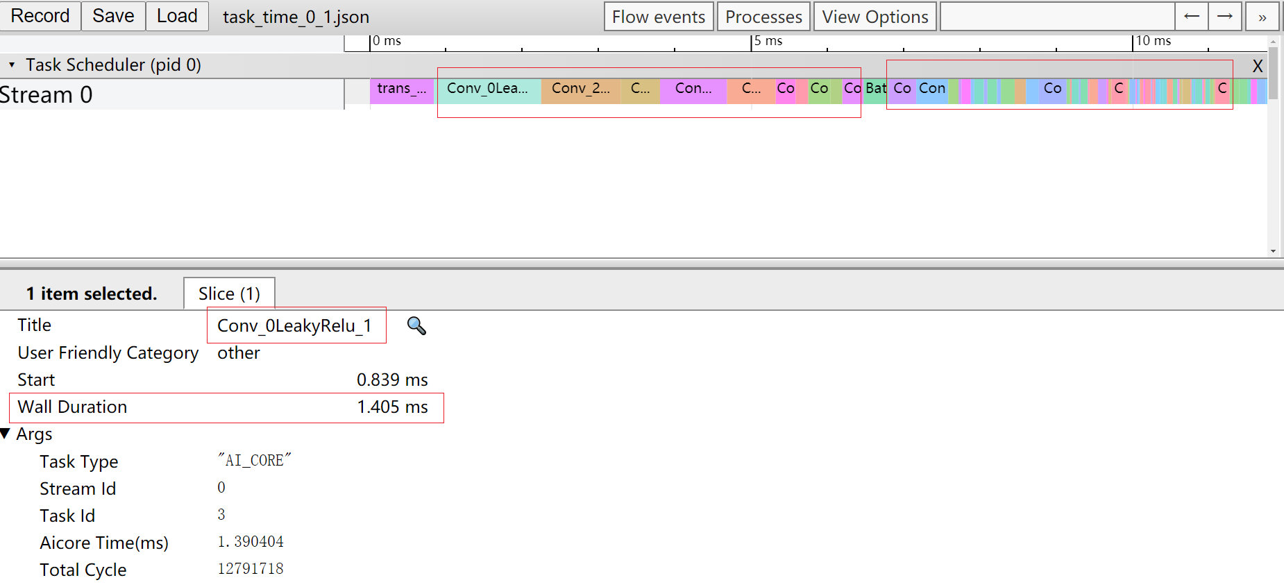 由于svp_acl_mdl_execute接口是执行接口,而模型中所有算子执行的时间总和就是执行耗时。那么我们通过打开task_time_{device_id}_{model_id}_{iter_id}.json文件查看Task Scheduler任务调度信息数据,分析执行推理过程中具体耗时较长的任务。如图4所示。