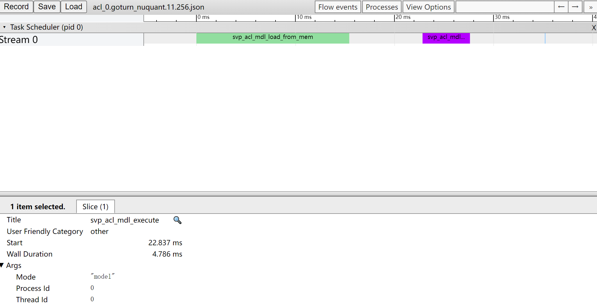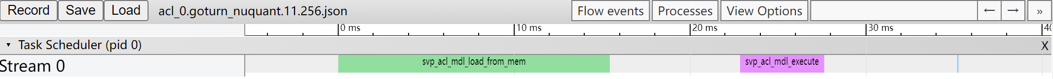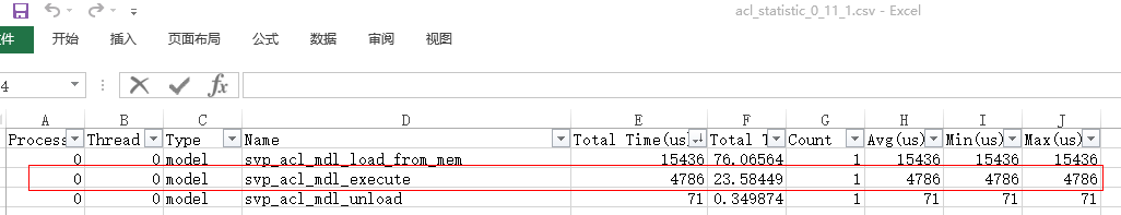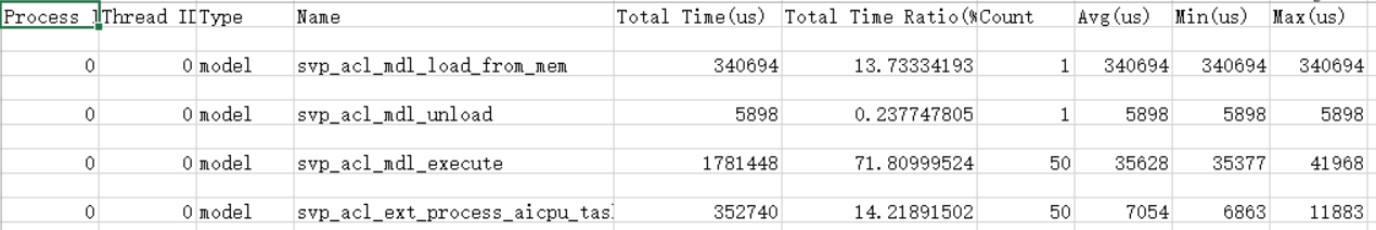 参见《应用开发指南》中的“ACL API参考”章节查找svp_acl_mdl_load_from_mem接口的作用为“从文件加载离线模型数据”,可以分析该接口耗时取决于加载离线模型的时间,加载时间我们暂时无法进行调优。那么还需要继续从svp_acl_mdl_execute接口深入分析。