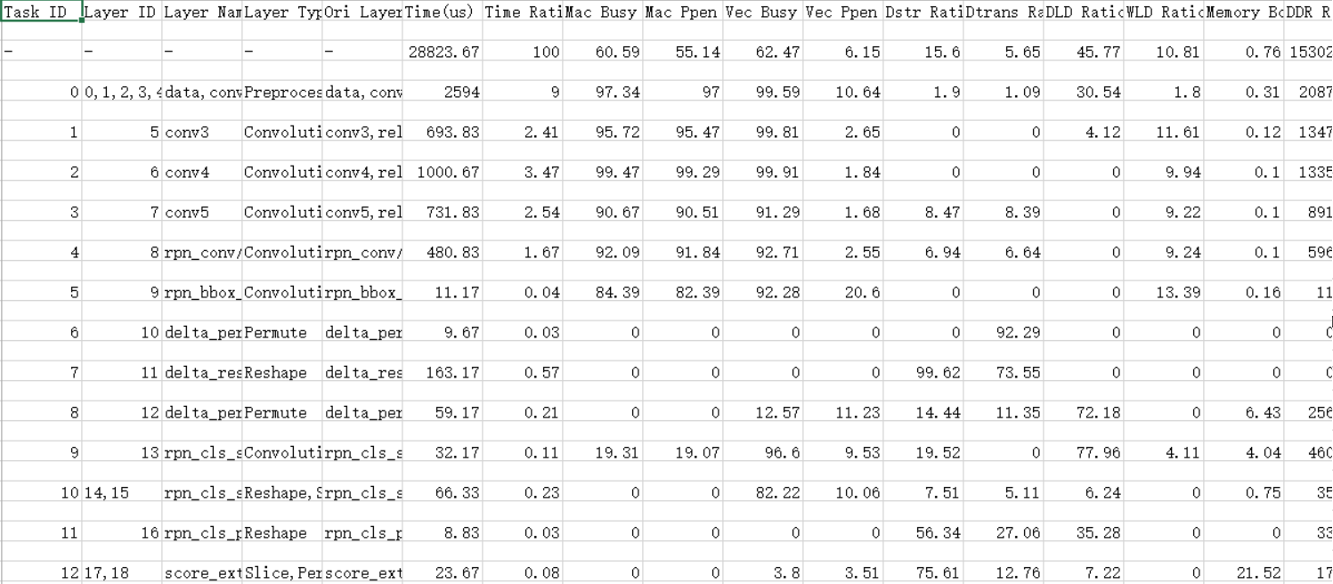 根据以上三张表中数据可以判断:各个组件耗时信息数据中ACL接口的svp_acl_mdl_load_from_mem接口耗时最长;ACL接口中耗时最长的时间线有两段,svp_acl_mdl_execute接口耗时排第二;Task Scheduler任务调度信息数据中存在大量的Conv算子,且每个Conv算子的执行时间都较长。