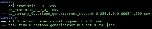 python3.7.5 msprof.pyc export summary -dir /home/HwHiAaUser/JOBXXX --format csv执行完上述命令后,会在collection-dir目录下生成summary目录,不同的数据(推理,系统)生成对应的csv文件,如图2所示,具体内容参见表2。
